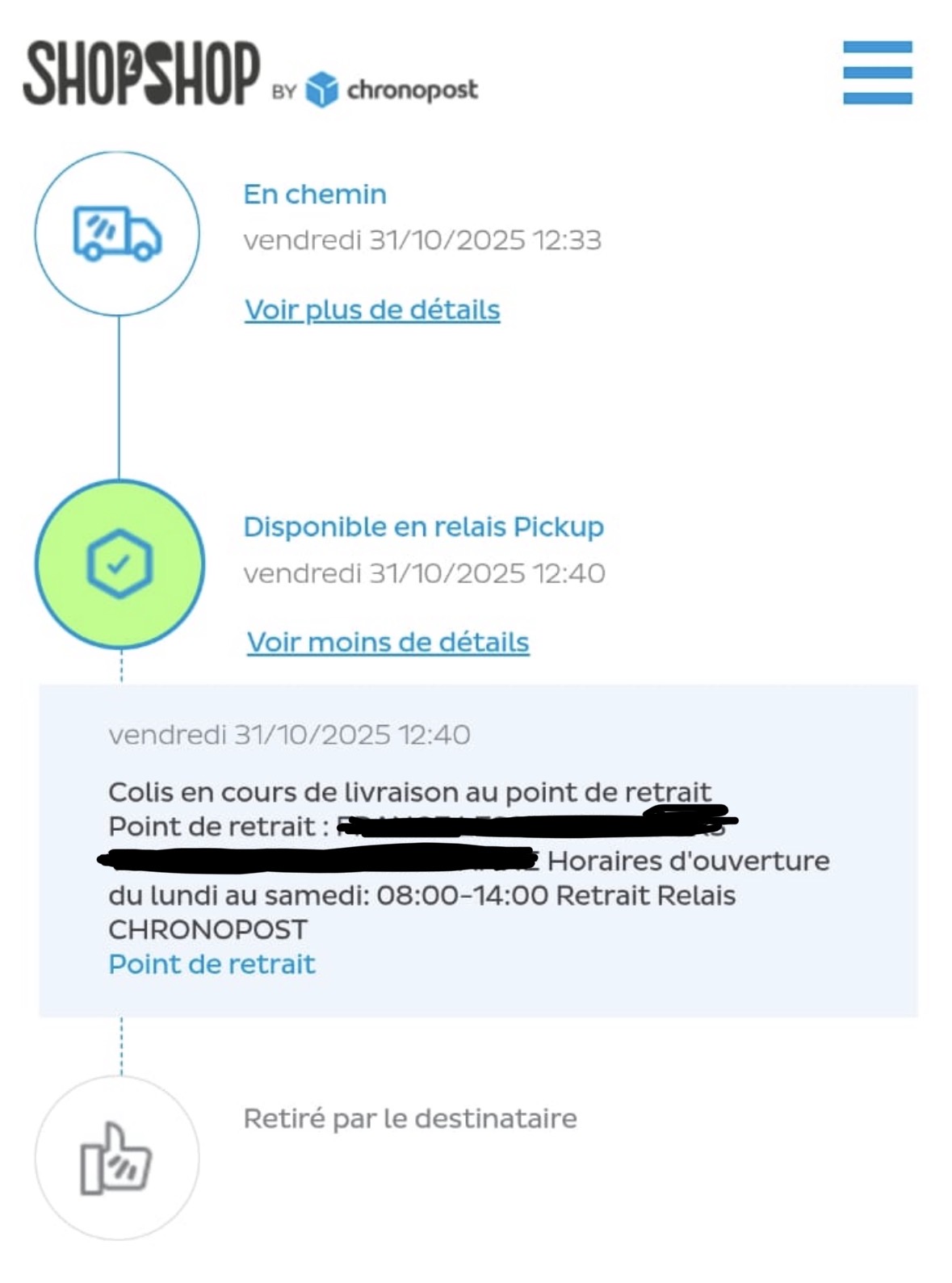 Fin octobre 2025, j’ai acheté un article avec livraison Chronopost en point relais. Le suivi indique seulement « disponible en relais Pickup », mais n’indique pas « retiré ou réceptionné par le destinataire », le statut n’a plus bougé depuis plus de 4 semaines.